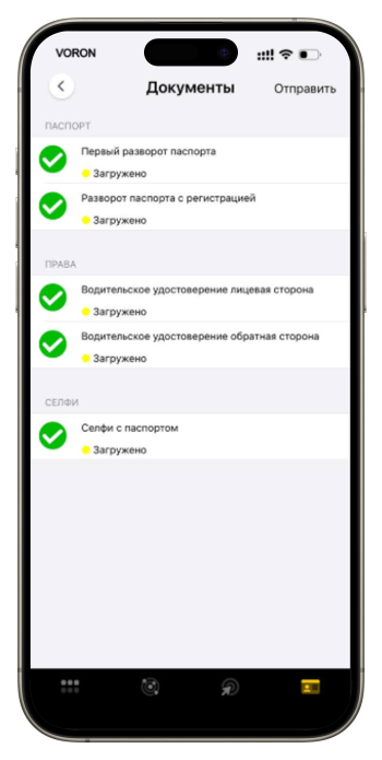 После прикрепления документов маленькие картинки меняются на зеленую галочку, и появится статус Загружено.