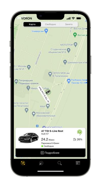Для того, чтобы самостоятельно забрать автомобиль требуется перейти в раздел Навигация с выбранной вверху вкладкой Карта и найти на карте интересующий вас и свободный автомобиль.