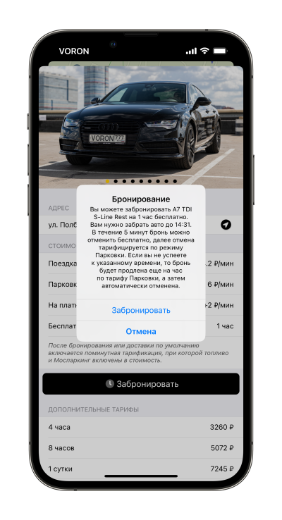 При нажатии на Забронировать приложение предупреждает о бесплатном времени и условиях отмены.