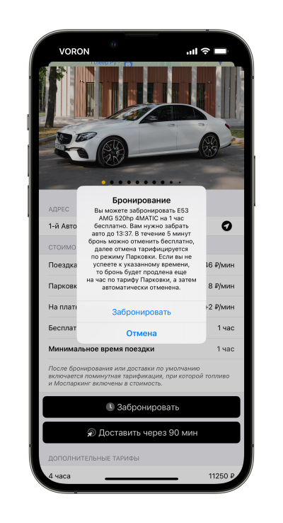 Если вы не заберете автомобиль через 2 часа после бронирования, то бронь автоматически отменится со списанием средств по тарифу Парковки за эти 2 часа.