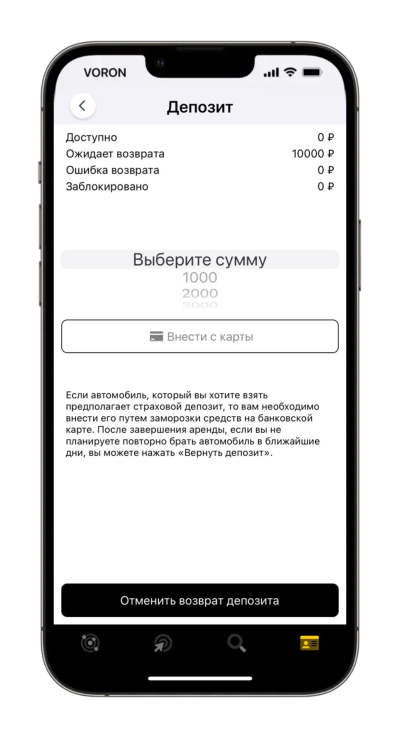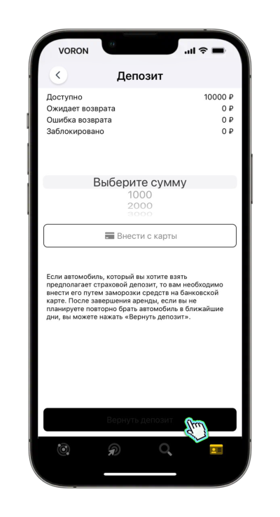 Для возврата депозита на экране Профиль нужно нажать на сумму депозита.