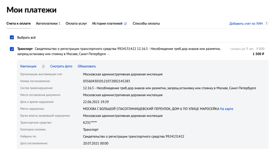 После добавления счет можно развернуть и появится более подробная информация о штрафе