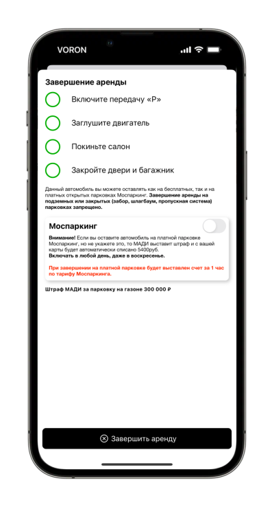 Для завершения аренды достаточно выбрать на платной вы парковке или нет включением переключателя и подтвердить действие нажав Завершить аренду.