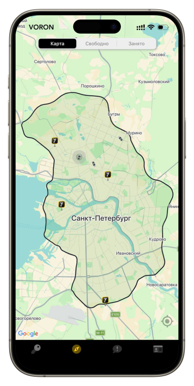 Зона завершения аренды (зеленая зона) появляется на карте в приложении при нажатии на автомобиль и обозначена зеленой областью.