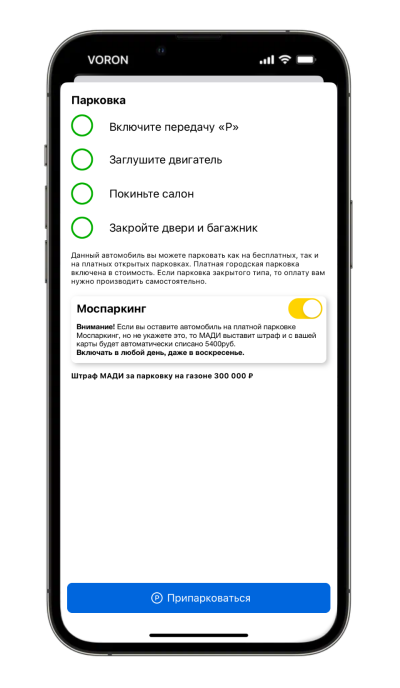 При постановке автомобиля на платной парковке вам необходимо в течение пяти минут (по правилам Моспаркинга) в обязательном порядке включить переключатель Платная парковка и перейти в режим Парковка. Иначе могут сфотографировать автомобиль и прислать штраф.