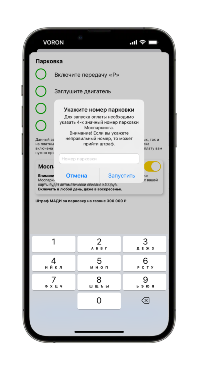При переводе ползунка «Р» появится экран, на котором будет предупреждение о платной парковке и сам переключатель.