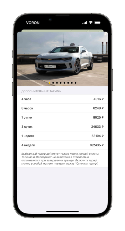При бронировании по умолчанию включаются поминутные тарифы и действую до тех пор, пока вы не оплатите другой тариф. Все часовые/суточные тарифы указаны в мобильном приложении на странице каждого автомобиля в разделе дополнительные тарифы.